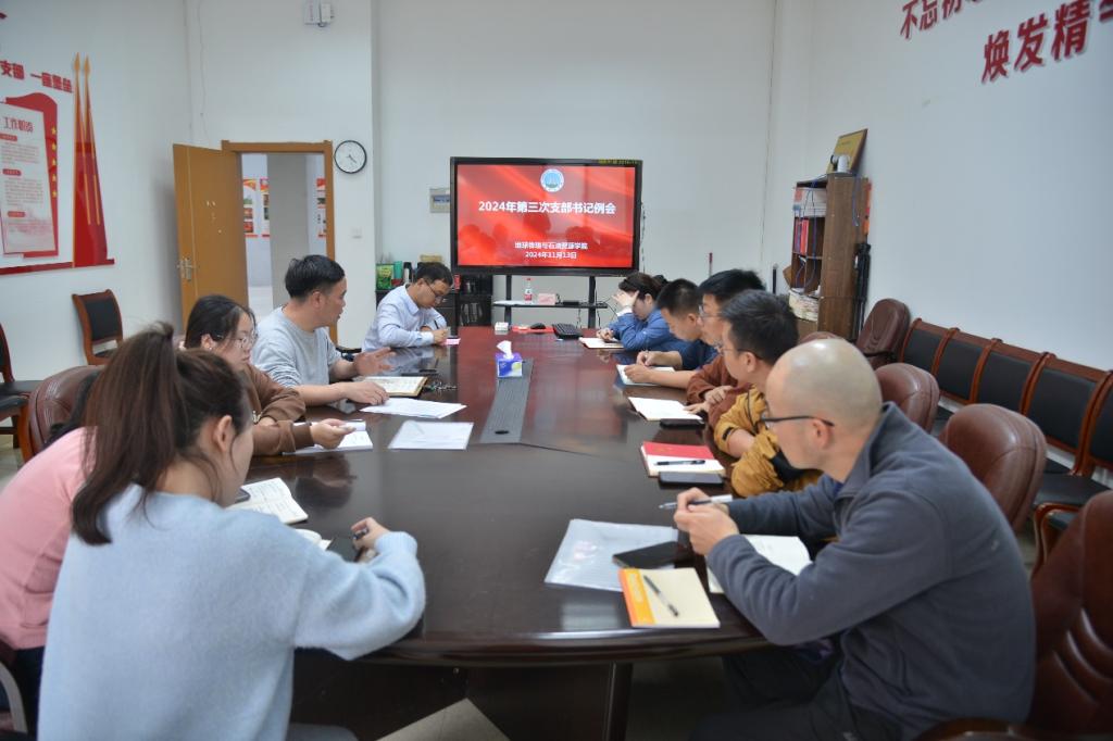 11月13日下午,分党委在石油科技大楼D111会议室召开2024年第三次党支部书记例会。分党委书记周俊、副书记焦简金及全体党支部书记参加会议,会议由周俊主持。
